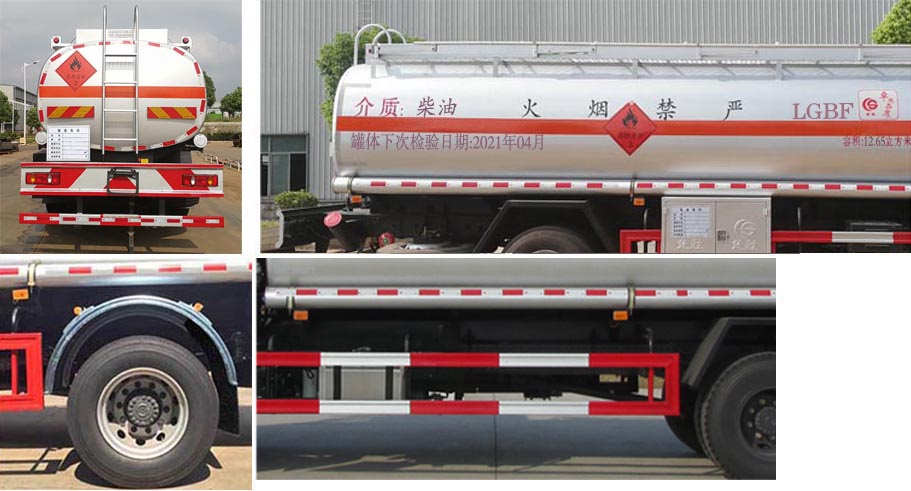 配置 | 1、該車適用于危險品運輸,運送危險貨物車輛類型為:FL型,類項號:3。罐體有效容積:12.65立方米,運輸介質:柴油、煤油、汽油,密度:830、800、700千克/立方米,罐體外形尺寸(長×寬×高)(mm):5700×2000×1400。罐體上部選裝上走道;選裝后部尾燈架樣式;選裝弧形擋泥板;選裝左側無工具箱。加油機型號及生產企業:BL1111Z/珠海市貝林加油設備有限公司中山分公司,HS1812B/托肯恒山科技(廣州)有限公司,SKES-1112/恒和嘉華科技有限公司(上海伯萊機械有限公司),SK20QF-111A、SK20QF-222A/鄭州三金石油設備制造有限公司,CS20D1110F/正星科技有限公司,JSK-70B1121CZ,JSK-70B1121C,JSK45B1121C/穩恩佳力佳(北京)石油化工設備有限公司, ZH6444/佛山市眾澤機電科技有限公司, XTST121BF1/邢臺正潤通科技發展有限公司,TA-1111KFJ/沈陽航天新陽機電有限公司。2、側,后防護材料均為Q235,螺栓連接;后防護截面尺寸120×60mm,下邊緣離地高500mm。3、僅采用軸距(mm):4700。隨底盤選裝駕駛室前面罩,選裝側窗玻璃;駕駛室頂部中間三個裝飾燈為選裝件;前霧燈為選裝件;駕駛室前臉擾流罩為選裝件。僅選用排氣管前置、限速裝置(限速80km/h)、前輪盤式制動及子午線輪胎的底盤;安裝帶有衛星定位功能的行駛記錄儀;后軸采用空氣懸架,轉向輪安裝輪胎爆胎應急防護裝置。ABS型號/生產廠家:3631010-C2000/東科克諾爾商用車制動系統(十堰)有限公司。 | ||