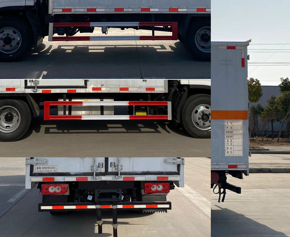 配置 | 該車為危險品運輸車,運輸具有**容器(瓶)包裝的物品,運送危險物品類項號:4.1,4.2,4.3。廂體頂部封閉,不可開啟。側后防護材料均為Q235,螺栓連接,后防護截面尺寸(mm)100×50,下邊緣離地高450mm。選裝后部尾板,選裝后部尾板時后防護材料為Q235,螺栓連接,截面尺寸(mm)φ100,下邊緣離地高450mm。廂體選裝側開門及位置或無側門、選裝后門雙拉桿,廂體選裝瓦楞板結構,選裝百葉窗。僅選用排氣管前置、限速裝置(限速80km/h)、前輪盤式制動及子午線輪胎的底盤;轉向輪裝備輪胎爆胎應急防護裝置。安裝帶有衛星定位功能的行駛記錄儀。ABS型號/生產廠家:ABS-E/威伯科汽車**系統(**)有限公司,ABS-VI·E/廣州瑞立科密汽車電子股份有限公司,YF8/武漢元豐汽車電控系統有限公司。發動機/油耗值(L/100Km)對應關系為: F2.8NS6B131/11.47,Q28-130E60/11.02。尾板收起狀態水平長度為280mm,尾板質量為350kg。選裝ETC。 | ||