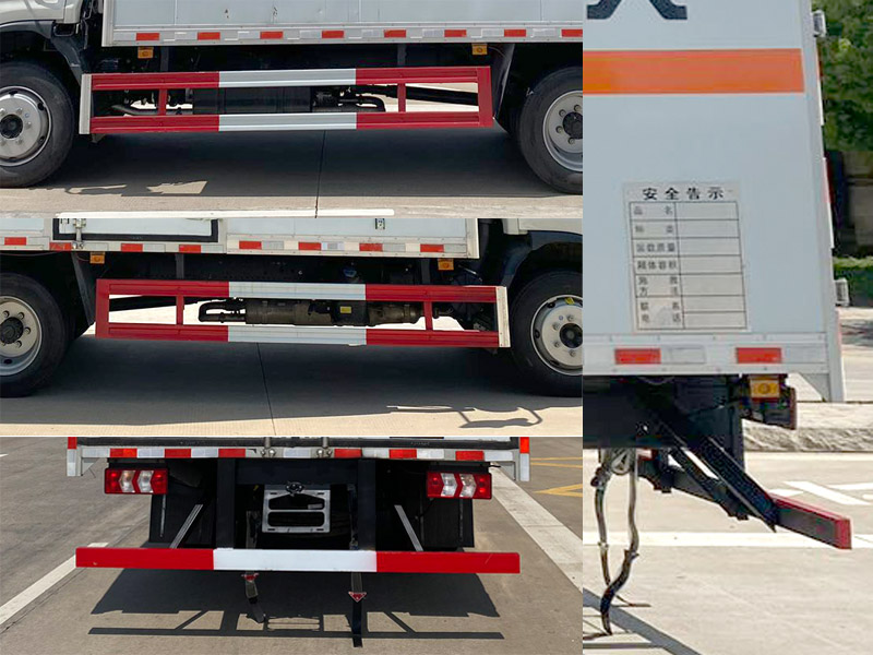 其它:1、該車適用于運輸危險品,運輸具有獨立容器(瓶)包裝的物品,運送危險物品類項號:9.廂體頂部封閉,不可開啟.2、側、后防護材料均采用Q235,側防護螺栓連接,后防護焊接,截面尺寸(mm)100×50,下邊緣離地高450mm.外形長/后懸/對應關系為(mm):7200/2280,7050/2130.3、僅選用排氣管前置、限速裝置(限速80km/h)、前輪盤式制動及子午線輪胎的底盤,轉向輪安裝輪胎爆胎應急防護裝置.安裝帶有衛星定位功能的行駛記錄儀.ABS系統控制器型號/生產廠家:VIE ABS-Ⅱ/浙江萬安科技股份有限公司.發動機/油耗值(L/100km)對應關系為:D30TCIF2/20.1,HFC4DE2-2E/20.60.該車可選裝ETC車載裝置.4、隨底盤選裝駕駛室.廂體側面選裝不同型式側開門及開門位置或不帶側門,選裝開百葉窗,選裝瓦楞板結構,選裝后門結構.
