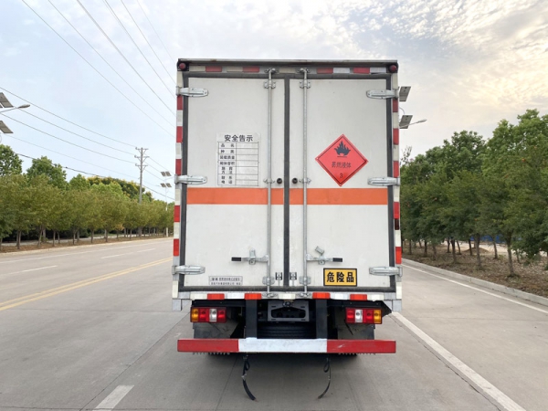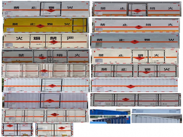 1、復合板工藝:嚴格按照公告尺寸制作。外板采用優質烤漆板(顏色可選:白,灰,檸檬黃)帶百葉窗,內飾為導電性能良好的鋁平板有透氣孔,矩形骨架結構內部填充防火阻燃材料,復合加鉚合工藝。廂體四周鋁合金包邊及包角,車廂底板鋪設防靜電膠皮,廂體前臉50公分高鋪設防靜電膠皮。后部設置對開門,右側單開門,廂體內部兩側安裝捆綁貨物的臥環。廂體內部安裝煙霧報警器,門上安裝防盜報警器。車廂一周粘貼橙色反光帶,箱體粘貼菱形標志牌,安全告示牌,危險品牌,箱體安裝示廓燈(前白后紅),拖地靜電帶。