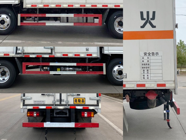 其它 | 1、該車為危險品運輸車.運輸具有獨立容器(瓶)包裝的易燃液體物品.運送危險物品類項號:3類.廂體頂部封閉不可開啟.2、側,后防護材料均為Q235,側防護螺栓連接,后防護焊接,截面尺寸(mm):100×50,下邊緣離地高430mm.3、整備質量含備胎,滅火器及隨車工具;貨廂重量為1090kg;材質/厚度:復合板結構廂體:底板材質為Q235,厚度3mm,側板為外Q235+中間阻燃泡沫+內純鋁板,厚度42mm;瓦楞板結構廂體:底板材質為Q235,厚度3mm,側板為Q235,厚度1.5mm.4、僅選用排氣管前置、限速裝置(限速80km/h)、前輪盤式制動及子午線輪胎的底盤,轉向輪安裝輪胎爆胎應急防護裝置,安裝具有衛星定位功能的行駛記錄儀.ABS系統控制器型號/生產企業: APG3550500A/浙江亞太機電股份有限公司,3550B500/浙江亞太機電股份有限公司,VIE ABS-II/浙江萬安科技股份有限公司.發動機/油耗值(L/100km)對應關系為:JX493ZLQ6D/10.75,JX4D25A6H/10.83.隨底盤選裝駕駛室,選裝白色中網,選裝白色前保,選裝黑色前保,選裝廂體側面選裝開門型式及位置,選裝不帶側開門,選裝貨廂平面或瓦楞結構;廂體側面選裝開百葉窗,選裝后部樣式,該車可選裝直接供電式ETC車載裝置. | ||
