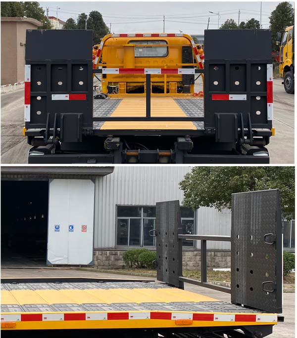 ABS型號:ABS/ASR-24V-4S/4M;ABS生產企業:襄陽東風隆誠機械有限責任公司;選裝描述:隨底盤選裝前面罩,前保險杠,前組合燈具,隨底盤選裝前盤式制動器,前霧燈為選裝件.選裝龍門架樣式,選裝后站板,選裝伸縮板;選裝后部上尾板;所用材料材質、連接方式以及后部防護裝置的主要尺寸參數(斷面尺寸和離地高度):側、后防護材料均為Q235,側防護螺栓連接;后防護焊接,截面尺寸100×50mm,下邊緣離地高450mm;專用功能及裝置:該車主要用于道路清障,主要專用裝置為絞盤、鋼絲繩、油缸、平板;托舉質量(kg):500; |